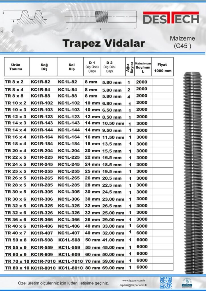 Trapezoidal screw shafts are manufactured from materials such as ST37, C45, AISI 303, AISI 304, AISI 303, AISI 316, AISI 316L, and we can manufacture from TR8 to Tr150 sizes with certified raw materials received from the best raw material producers in Europe.